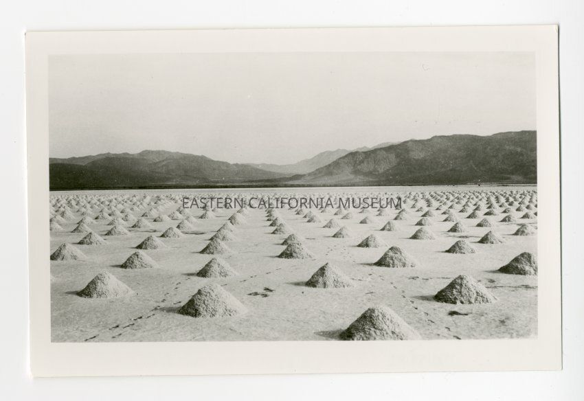 Photo of uniform piles of salt in Saline Valley. Produced by the Saline Valley Salt Co. There are a few footprints visible.Collection