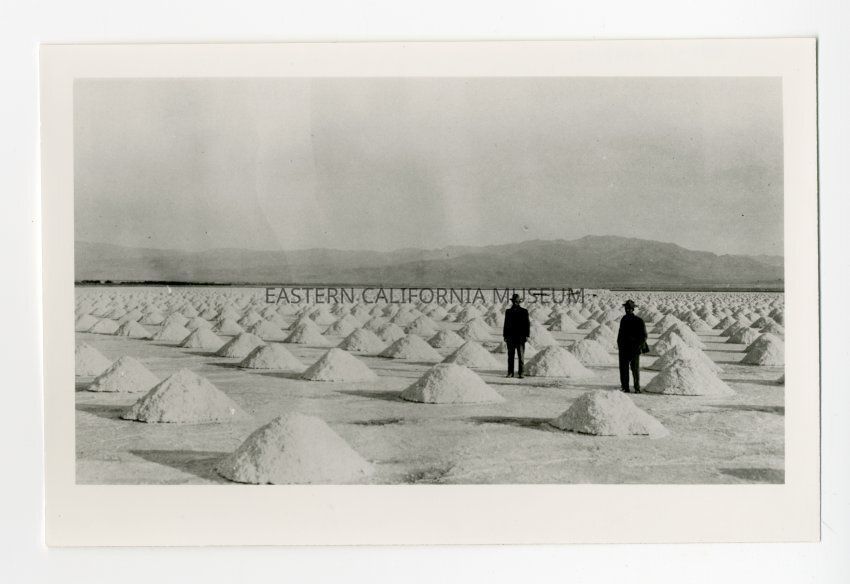 Photo of two men standing amid uniform piles of salt in the Saline Valley. Produced by the Saline Valley Salt Co.Collection