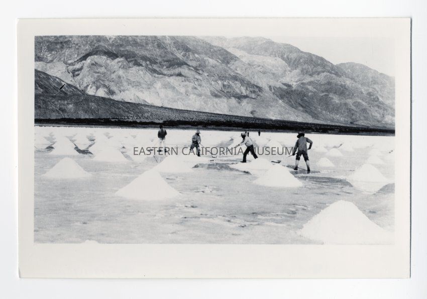Photo of several men employed by the Saline Valley Salt Co. using shovels to create uniform piles of salt.Collection