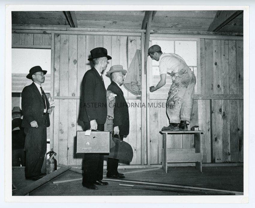 Photo of four men inside a barrack at Manzanar War Relocation Center (a fifth man is standing outside the door with his back to the camera). One man is standing on a stool working near a window. Two men are holding luggage, coat, and/or a briefcase.