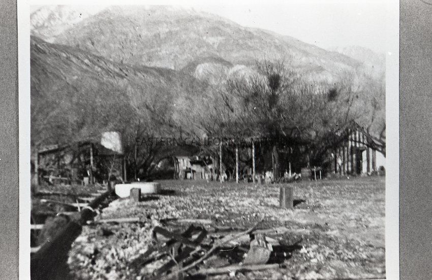 Photo of a structure, maybe a house and yard, likely built and used by the Saline Valley Salt Co.Collection