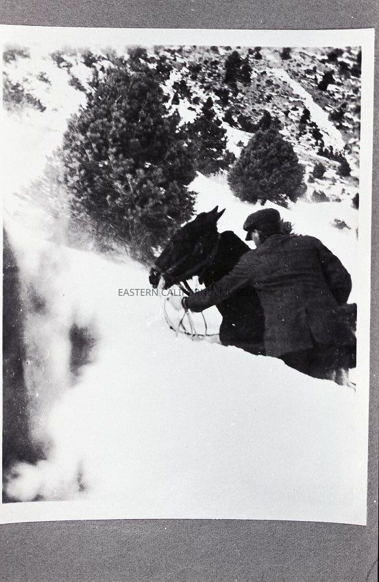 Photo of a man and horse in deep snow. The man's back is turned to the camera.Collection