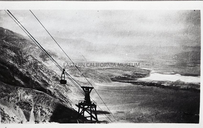 Photo of a salt bucket on the Saline Valley Salt Co. aerial tramway. There is a support tower in the foreground and Saline Valley is visible in the distance.Collection