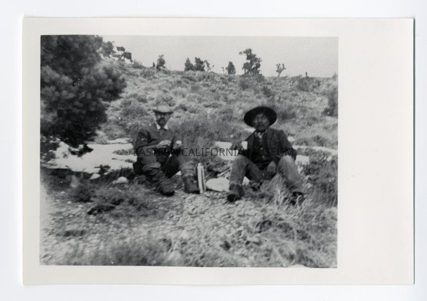 Photo of Johnny Hunter, Shoshone, and an unknown visitor taking a break on a hillside.Collection