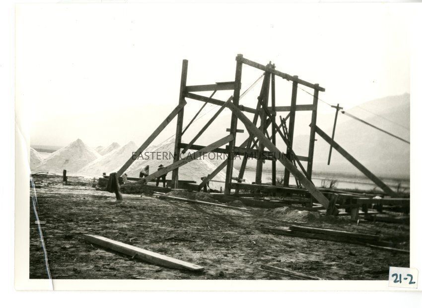 B/w photo of at least three men building a wooden structure (terminal?). Two men are using what looks like a two hand buck saw. Huge piles of salt in the background.