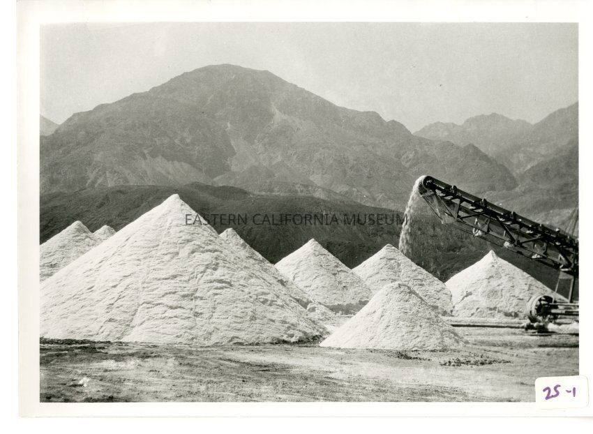 B/w photo of a conveyor belt dumping salt onto huge piles of salt with mountains in the background.
