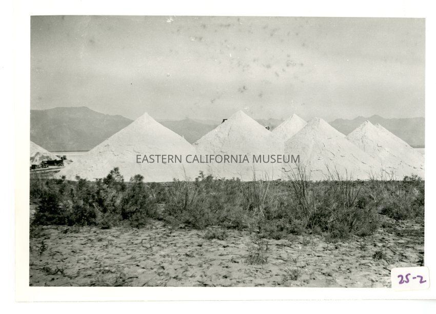 B/w photo of huge piles of salt with scrub vegetation in foreground.
