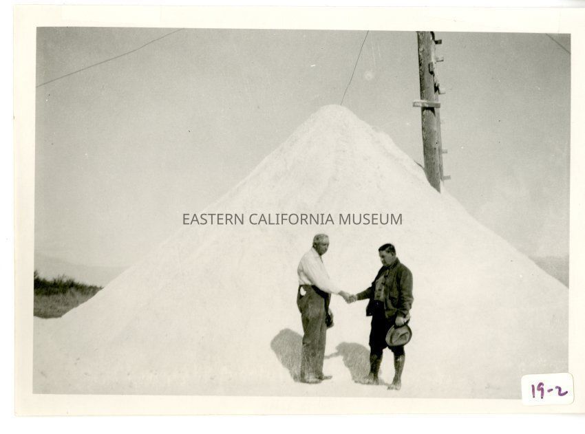 Label says: "Charles E. Coursen, right, and perhaps White Smith shaking hands in front of salt pile in Saline Valley about 1925."