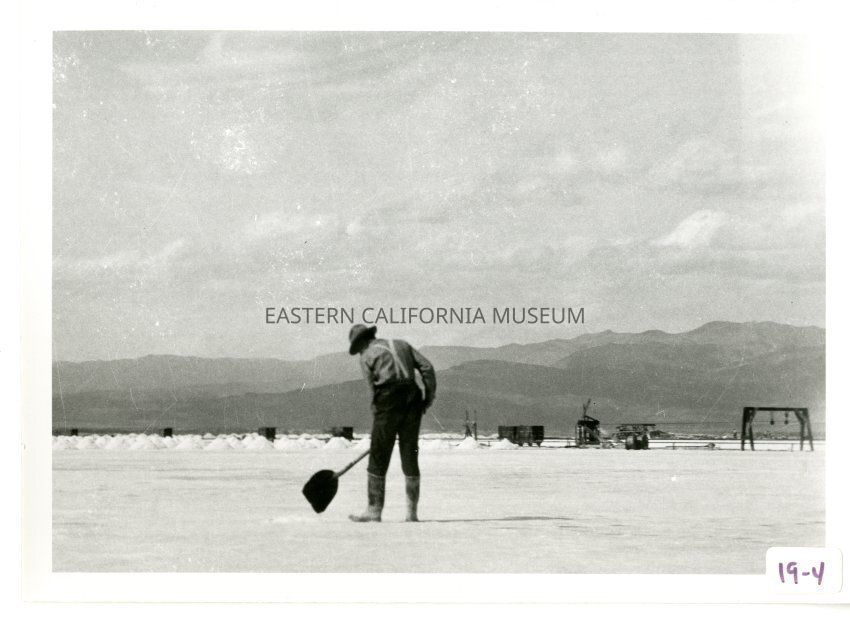 B/w photo of a man with a shovel working on the salt flats with equipment (salt carts, etc.), salt piles, and mountains in the background.