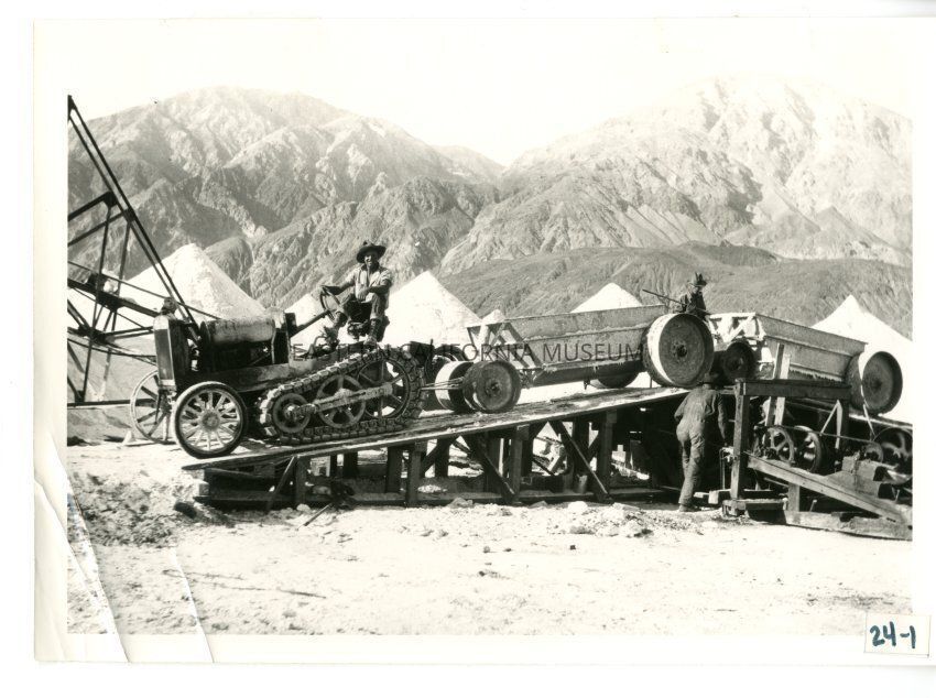 B/w photo of a man driving a tractor over a wooden ramp structure. The tractor is hauling two salt carts or "buggies." There are two other men also working in this photo. Huge salt piles and mountains in background.