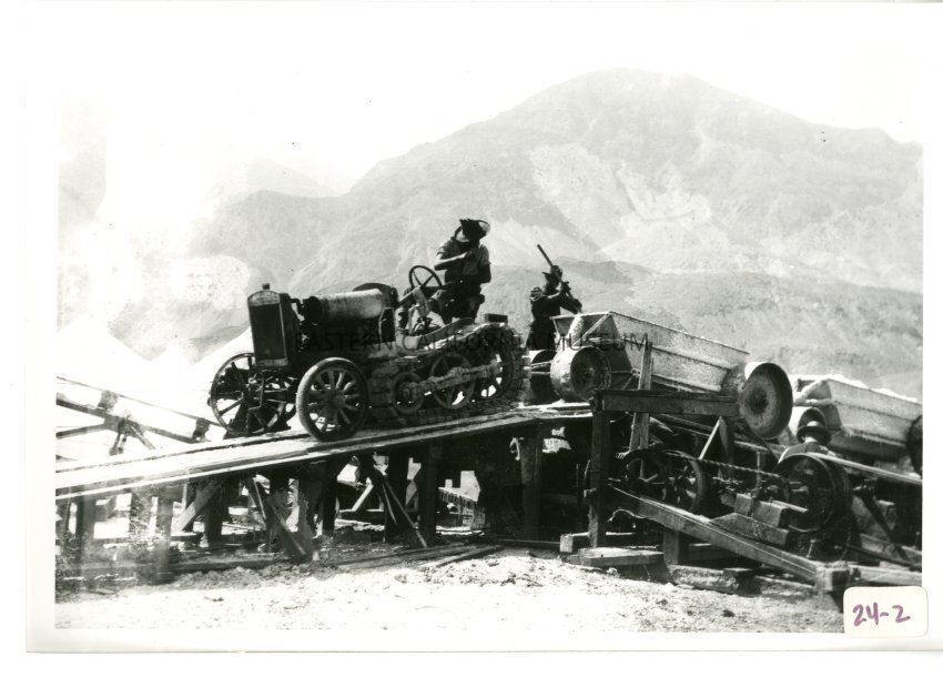 B/w photo of a man driving a tractor over a wooden ramp structure. The tractor is hauling two salt carts or "buggies." There are two other men also working in this photo. Huge salt piles and mountains in background.