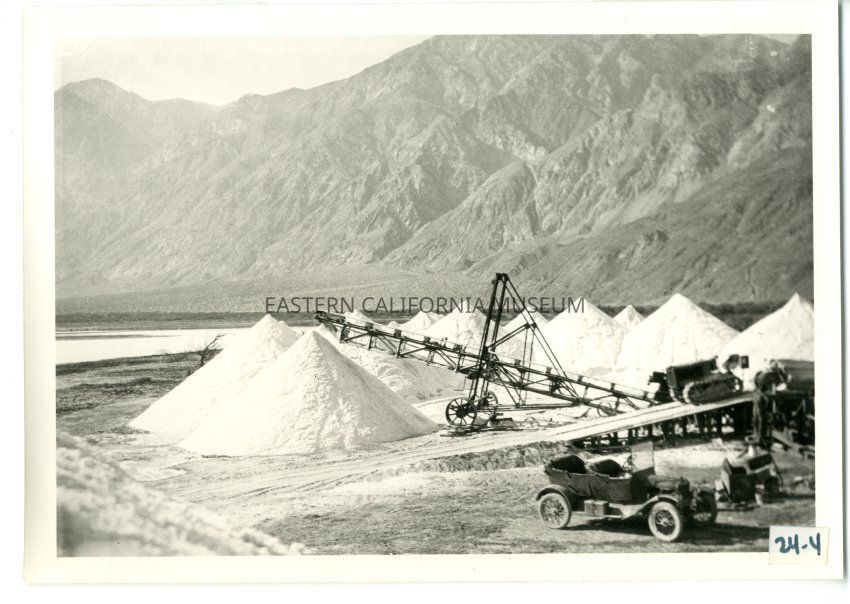 B/w photo of a conveyor belt and huge piles of salt with the mountains in the background. There is a open-top vehicle in the foreground.