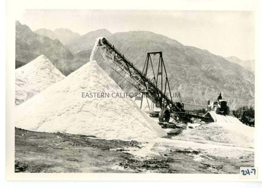 B/w photo of a conveyor belt dumping salt onto a huge pile of salt. Towards the right is a man driving a tractor over a wooden ramp.
