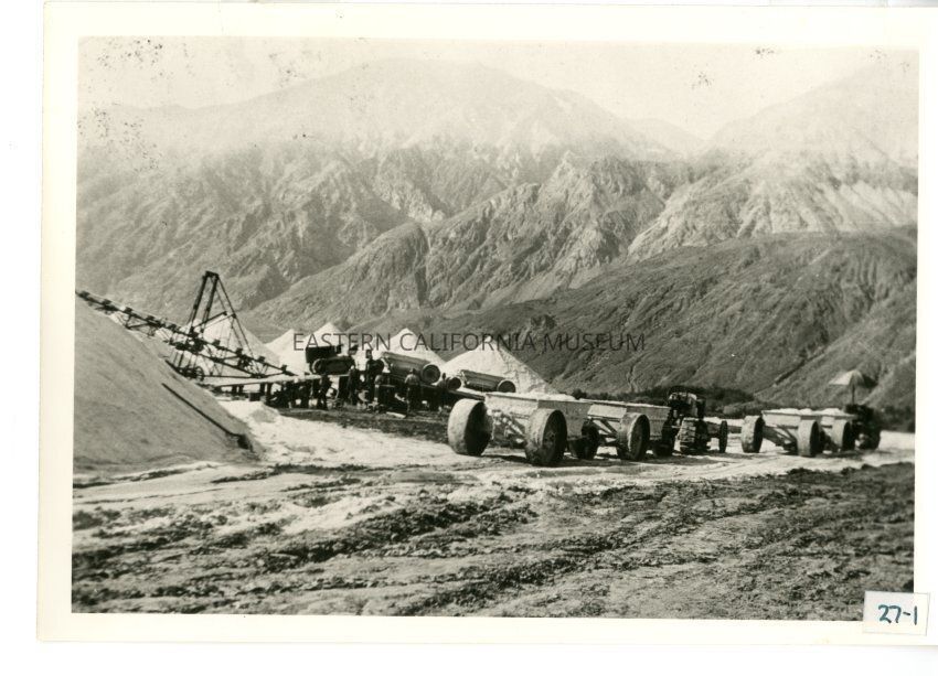 B/w photo of several salt carts or "buggies" with huge salt piles, conveyor belt, and mountains in the background.