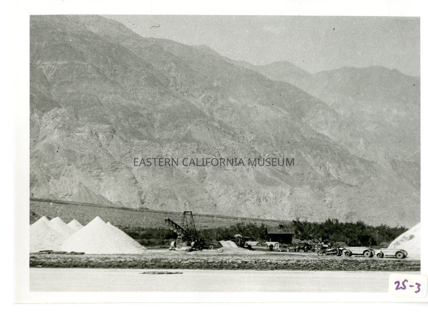 B/w photo taken from a distance of a conveyor belt, "buggies," a small building, huge piles of salt, and mountains.