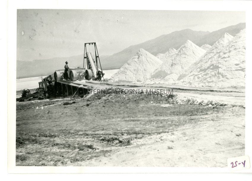 B/w photo of a conveyor belt, a couple "buggies" going over a ramp, a man, and huge piles of salt.