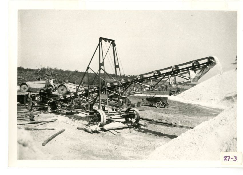 B/w photo of a conveyor belt dumping salt onto a huge pile of salt. A ramp with two "buggies" is behind the conveyor belt, and there is a tractor to the center right. An open-top vehicle is parked in the center of the photo.