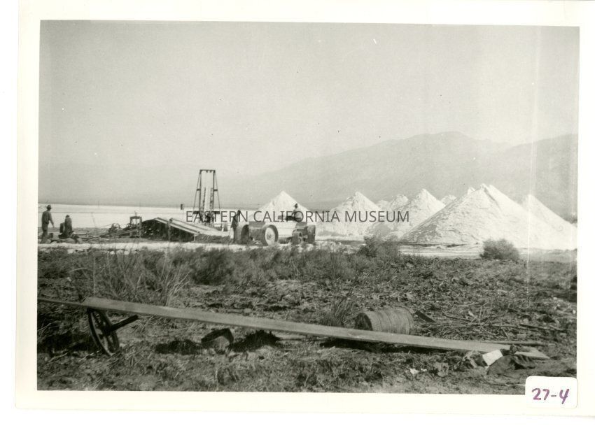 B/w photo of huge piles of salt with men working in the vicinity with tractors, "buggies," conveyor belts, etc.