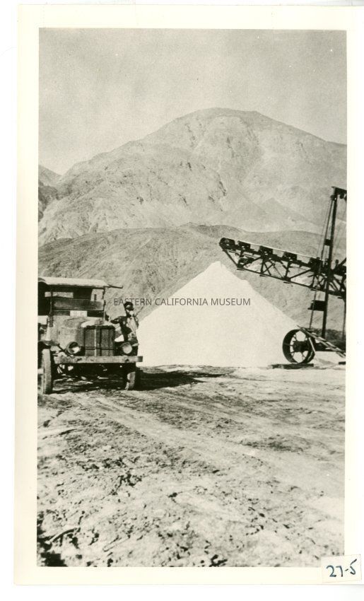 B/w photo of a single huge pile of salt next to a conveyor belt. There is a vehicle parked next to it with a man standing beside it. Mountains in the background.
