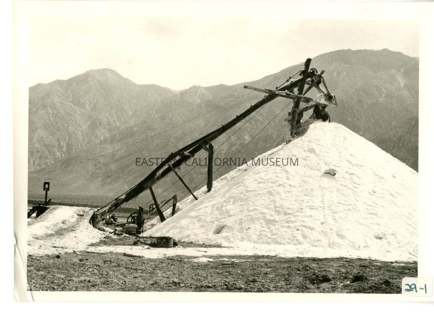 B/w photo of a tall/vertical conveyor-like machine next to a huge pile of salt with mountains in the background.