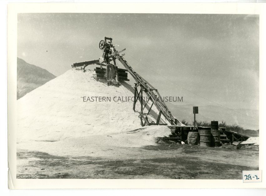 B/w photo of a tall/vertical conveyor-like machine and a huge pile of salt.
