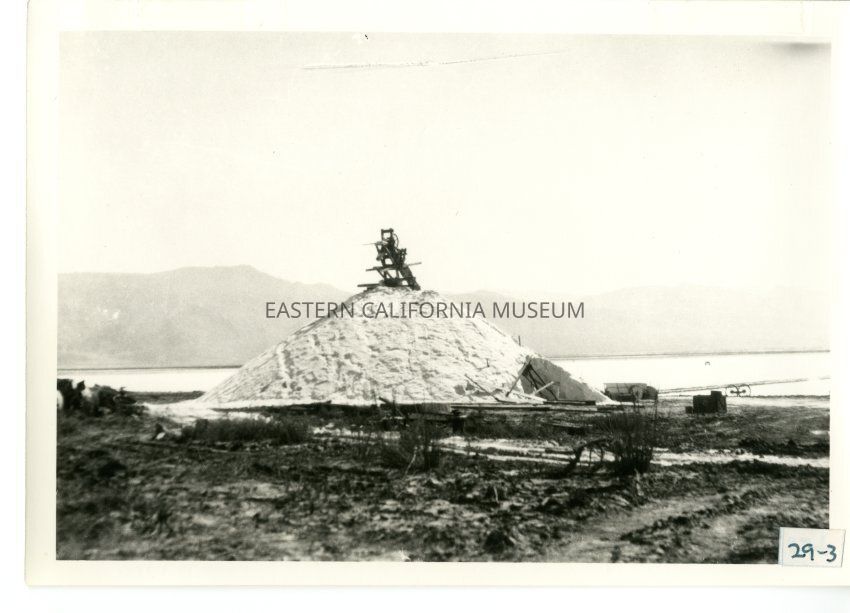 B/w photo of a huge pile of salt. The tall/vertical conveyor-like machine is visible above it.
