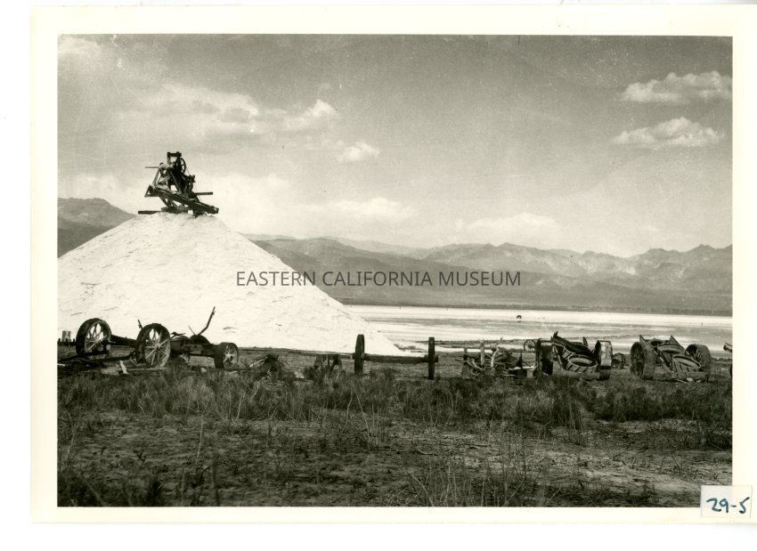 B/w photo of a huge pile of salt. The tall/vertical conveyor-like machine is visible above it. Salt flats, brine, and mountains in background.