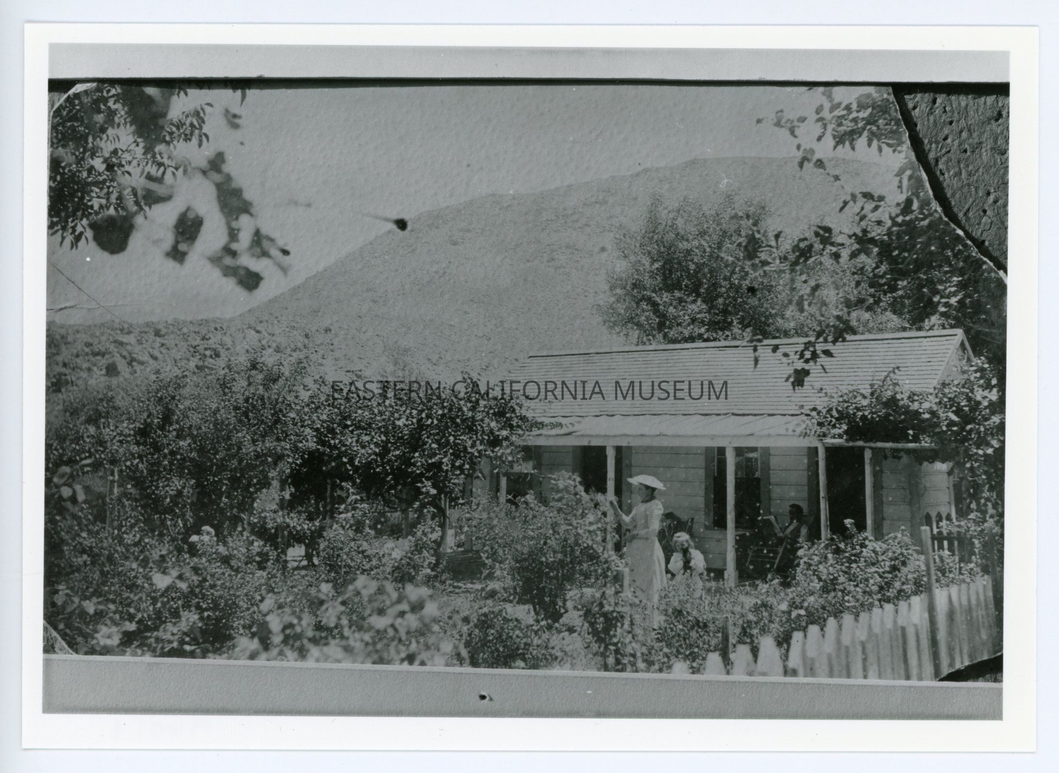 Copy of a photo of the Moffett Ranch at the north end of the Alabama Hills near Georges Creek showing the house and yard. Mr. and Mrs. Moffett and Lulu Roughny Moffett Mairs are in the picture.Collection