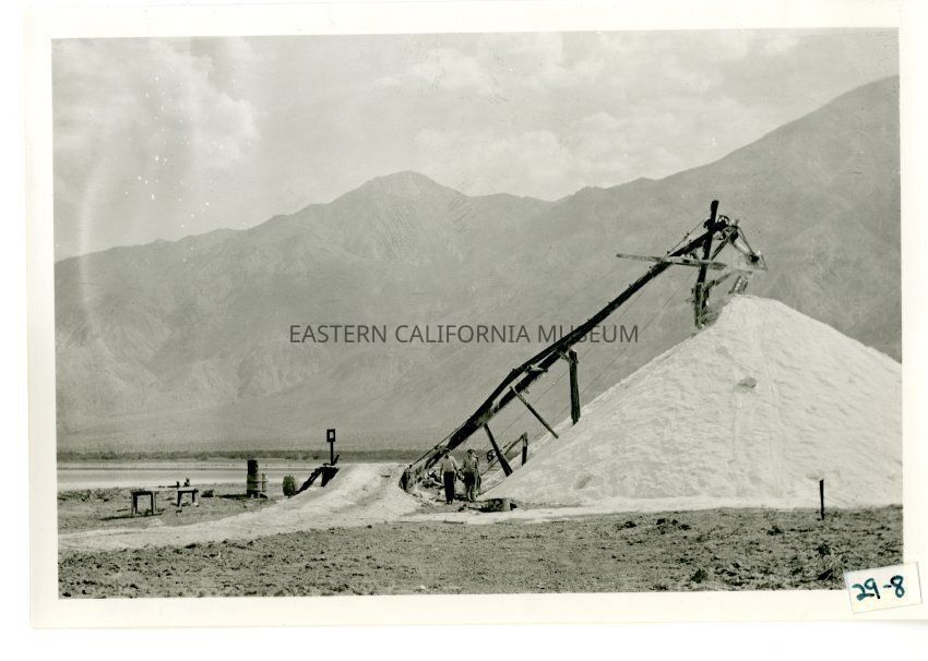 B/w photo of a tall/vertical conveyor-like machine and a huge pile of salt. At least two men are standing near the base of the machine.