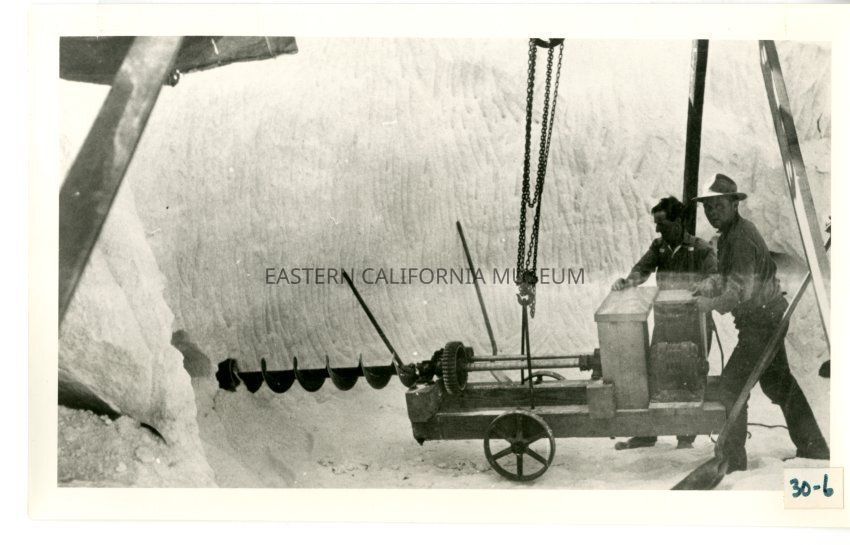 B/w photo of two men using a drill to drill into what appears to be a pile of salt.