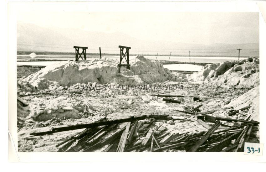 B/w photo of wooden debris admist what appears to be piles of salt. Power lines in the background.