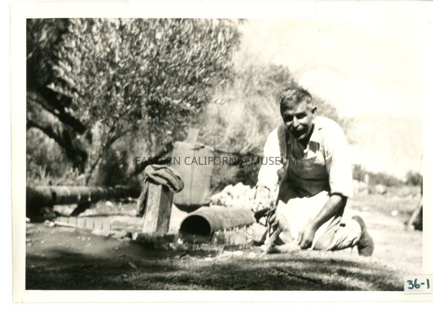 B/w photo of a man kneeling on the ground with a small fox or coyote.