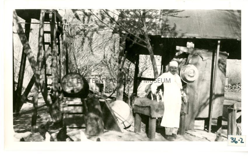 B/w photo of a man dressed in white (chef?) standing in front of a covered structure. It appears that there are two cats in his arms.