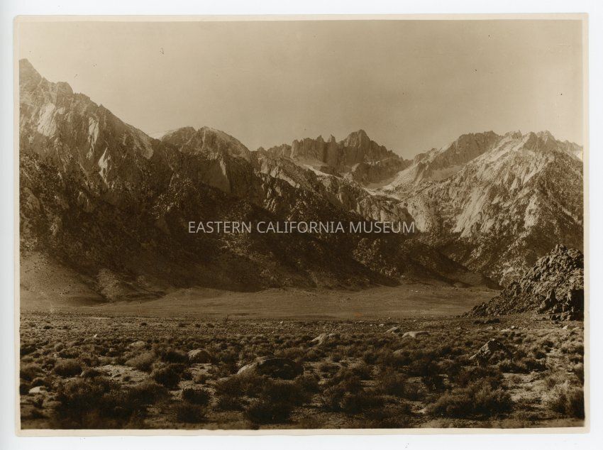 Sepia-colored photograph of Mt. Whitney. Written in pencil on reverse: Dec., 1910, No. 593, Mt. Whitney, Calif. Neg. by Smith.