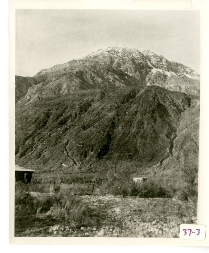 B/w photo of a mountain with a light dusting of snow and two small structures.