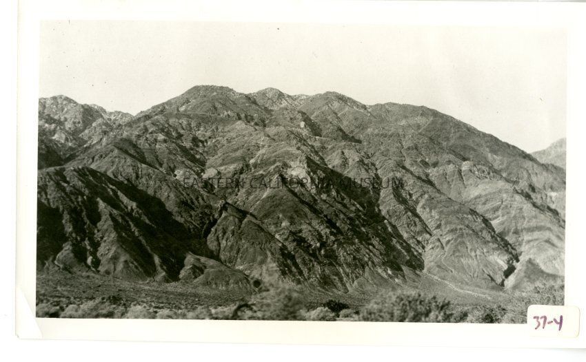 B/w photo of a mountain. Label says: "Inyo Mountains from Saline Valley, vicinity of Hunter Canyon."