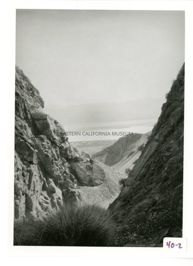 B/w photo of a canyon. Possibly salt flats and brine in distance? Or maybe just a lake?