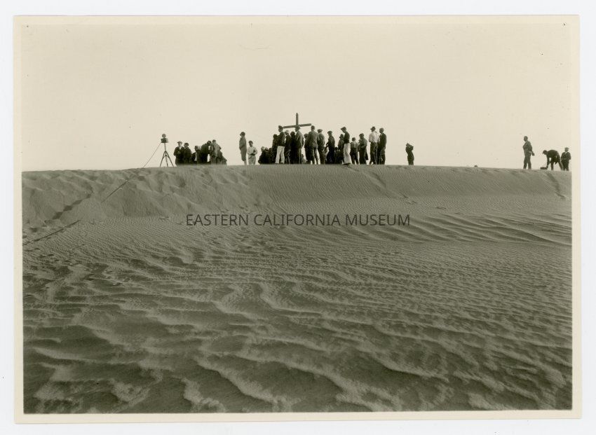 Photo of Easter Sunday sunrise service on the sand dunes at Bungalow City in Death Valley, 1928. There is a large group of people, a cross, and a device on a tripod.