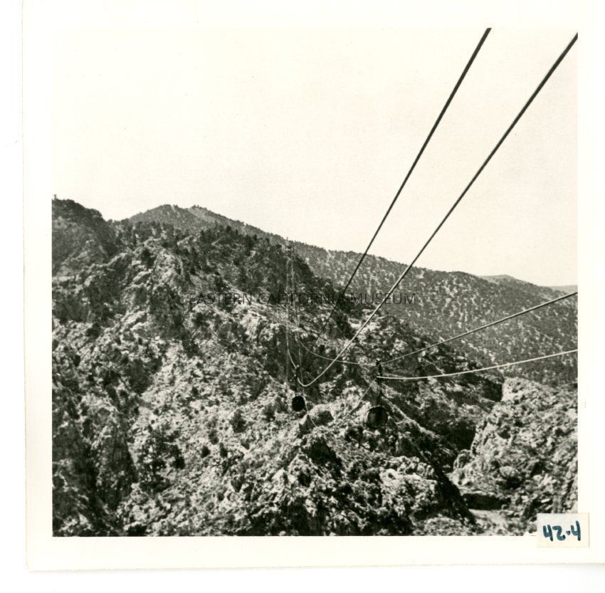 B/w photo of two tram buckets and cables.