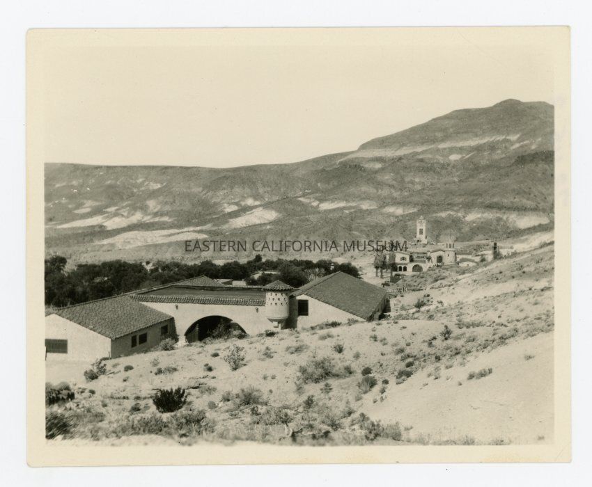 Photo of Death Valley Scotty's Castle, taken from a hillside looking down, circa 1930-1935.