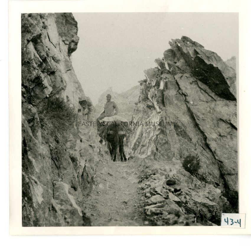 B/w photo of a man riding a loaded horse/mule through a pathway cut through rocks.