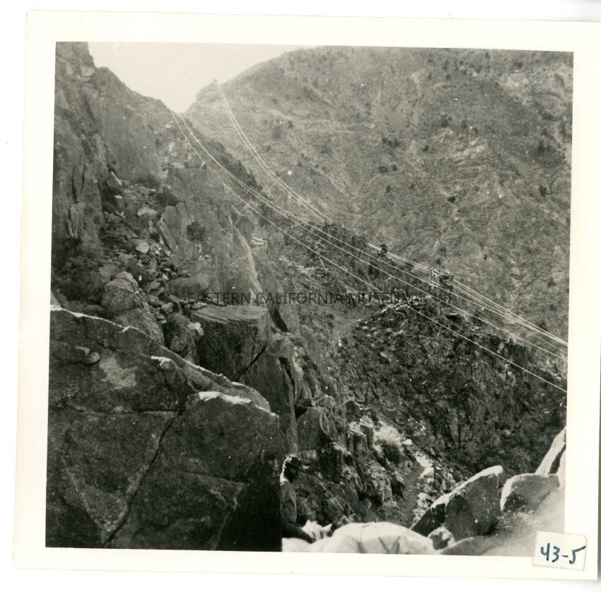 B/w photo of tram cables going up a mountainside.