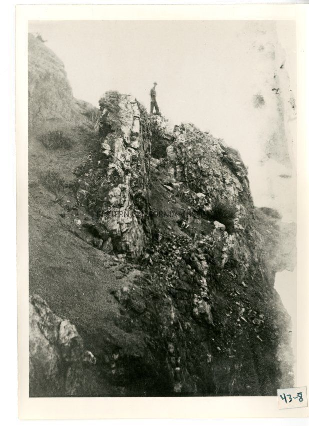 B/w photo of a man standing on top of a rocky outcropping on a steep mountainside.