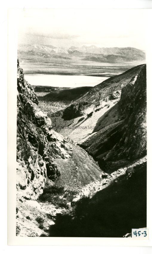 B/w photo of a canyon leading down to a lake (salt flats or brine?) with another range of mountains beyond.