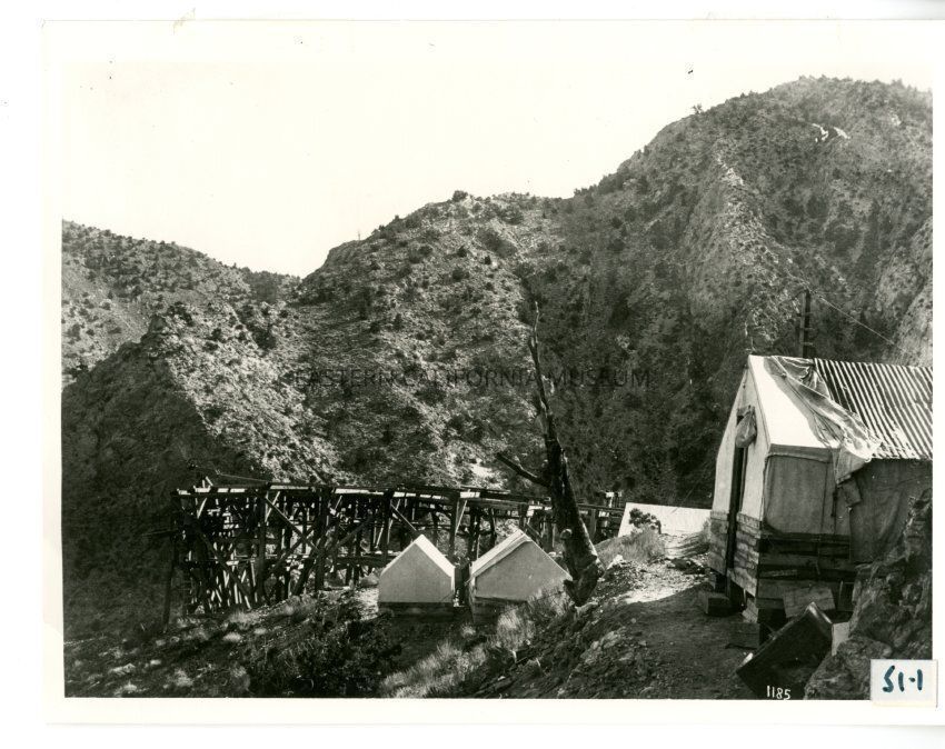 B/w photo of a camp with several tents and a tram tower station. Written in lower right corner is, "1185."