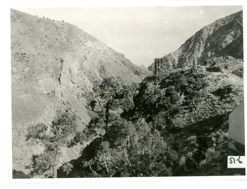 B/w photo of a canyon with two (three?) visible tram station towers. There is a tent in the lower right corner. Written in lower right corner is, "1192." Written on reverse is, "Stations 12, 13, and 14 from station 15."