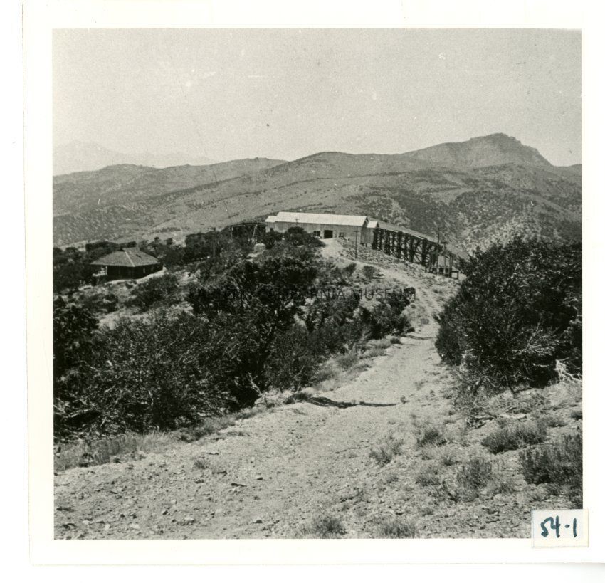 Label says: "Station 20 at the summit of the Inyo Mountains served as the control station for the third and fourth sections of the tramline. The road in the foreground leads south to Mexican Spring that served as a source of water during constructino of the tram and when the tram was shut down in winter. Mexican Spring is about 1.5 miles to the south, almost on the top of the ridge."