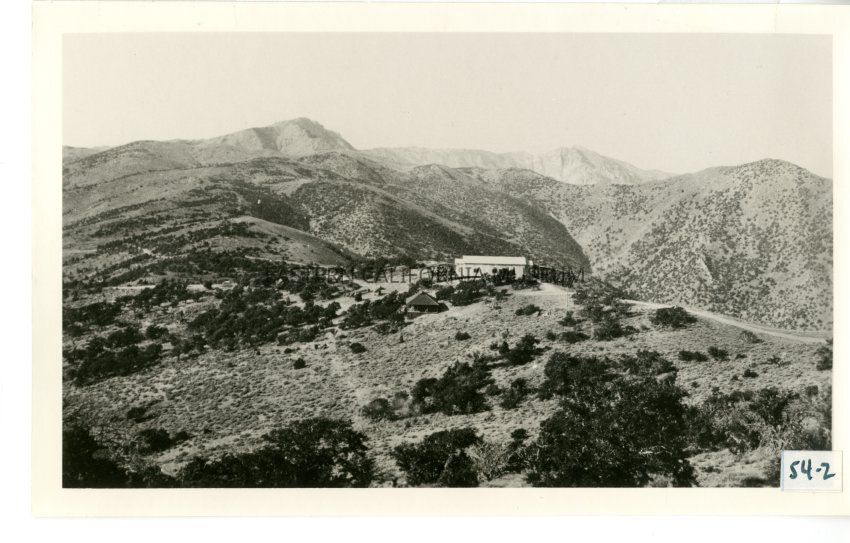 B/w photo of a tram station tower and large structure. There is a dirt road leading up to it. Label says: "Station 20 at the summit looking northeast."