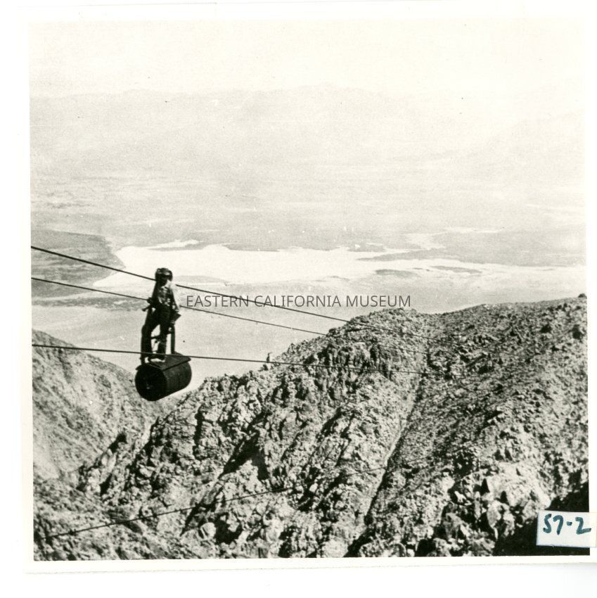 B/w photo of a man riding a bucket on cables.