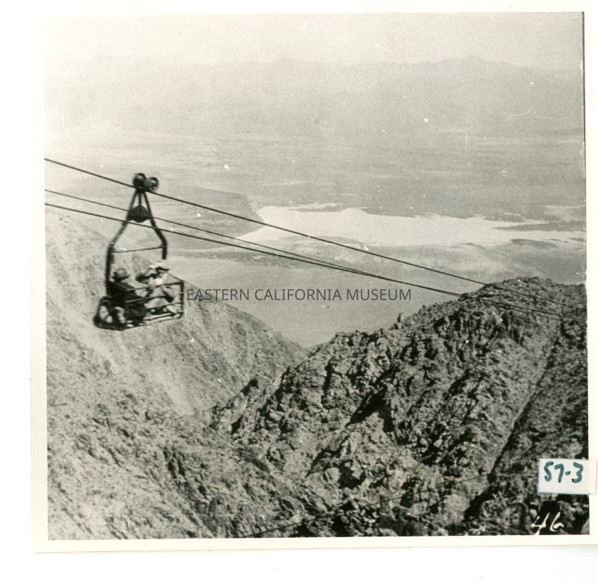B/w photo of two men riding in a "supply carrier" on the tram. The supply carrier is not a bucket. Written in lower right corner is, "46."